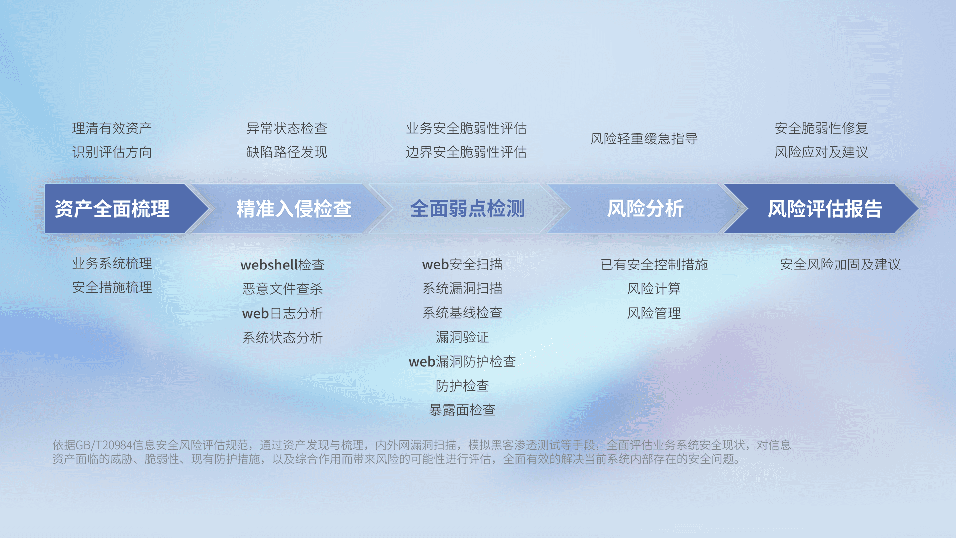 针对客户行业特性,,以专业的安全服务+多厂商联合解决方案提供专属的一站式安全管理服务,,帮助客户全面感知网络空间威胁,,基于识别、、检测、、、分析、、、、防护、、监测、、、、响应的服务理论模型,,从方案咨询、、、、集成交付、、评估验证、、、、优化加固、、、、运维运营,,致力于为客户提供完整的闭环管理式安全服务。。。以实战经验为客户打造高抵御风险的安全体系,,帮助客户发现威胁、、对抗威胁、、处置威胁,,,,不断积累安全对抗能力,,持续保障数字化安全。。。。