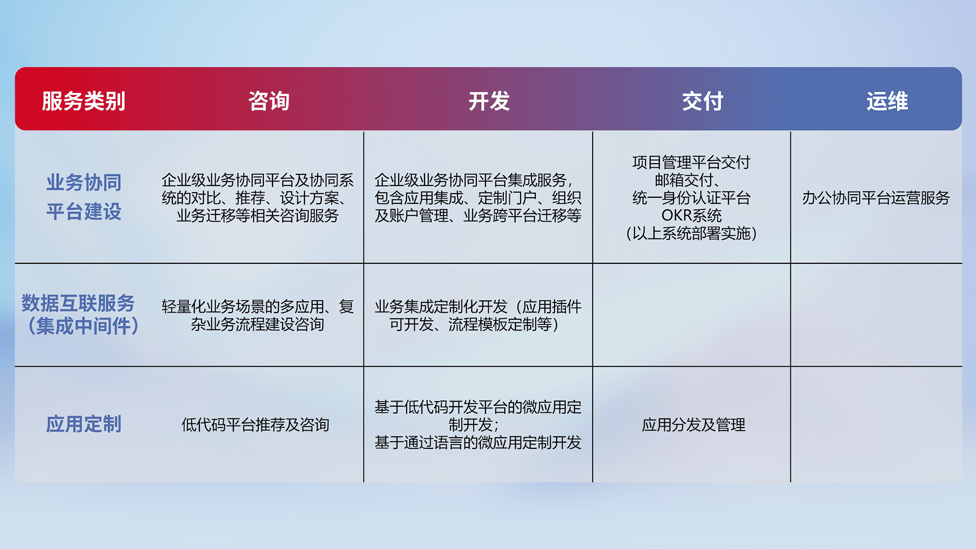 针对钉钉、、企微、、IDaas等平台级产品提供产品的规划、、、方案、、、交付、、、定制化开发等服务,,实现如统一协同办公、、、智能客户服务、、混合会议管理、、、智能数据查询、、、等业务场景,,,实现数字化转型。。